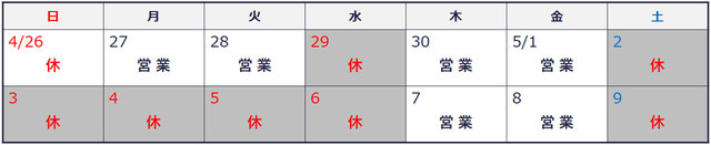 ゴールデンウィーク期間中の営業日程についてご案内いたします。